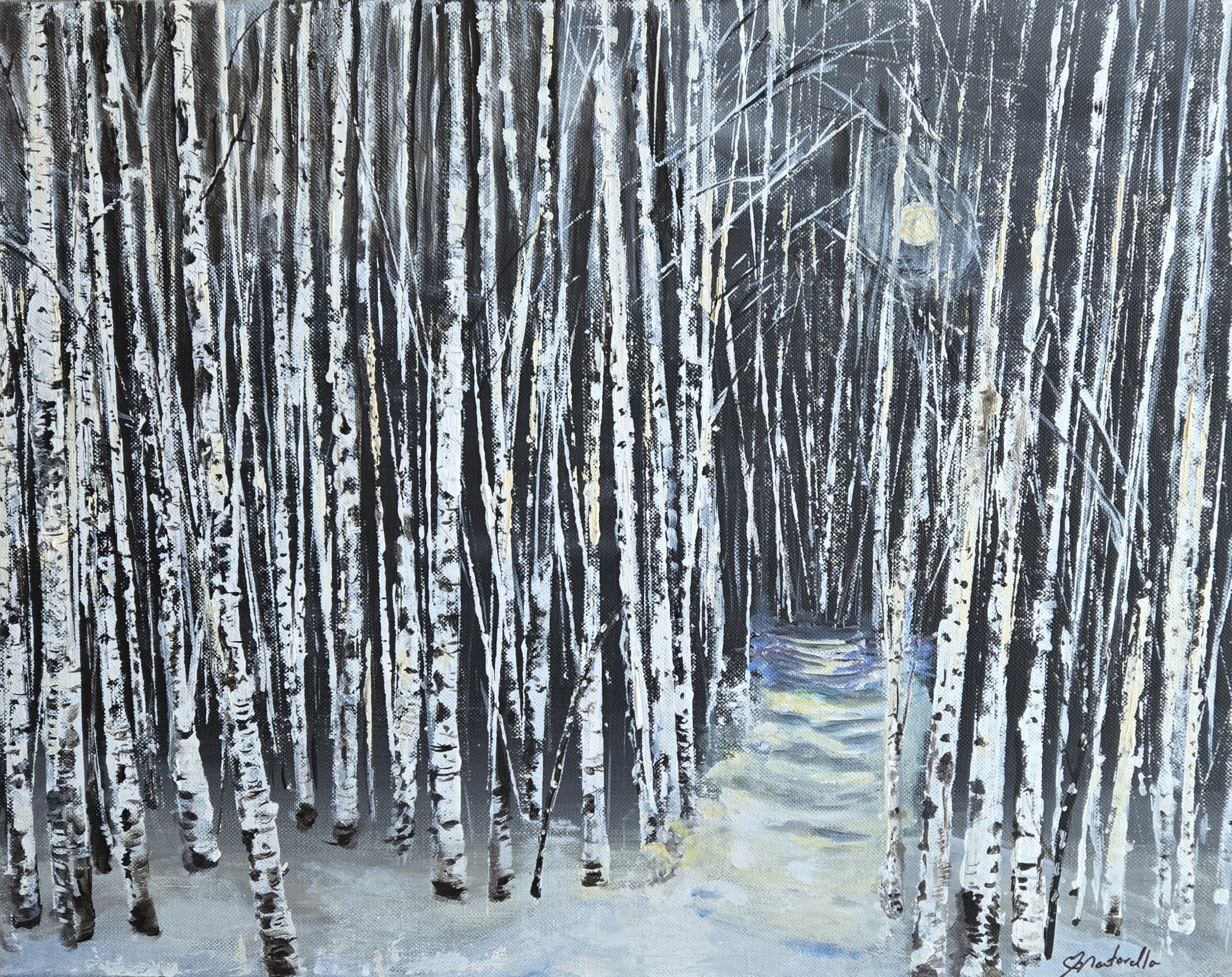 Happy New Year everyone .Here is my first painting of 2026. I had allot of fun with this. I didn't follow any rules . I even used black instead of mixing my black. Lol. I love birch trees . There's something about them . Maybe it's the contrast with the light and dark values side by side. This was created without a reference photo. That's what it's all about sometimes, just having fun creating and watching the process evolve.